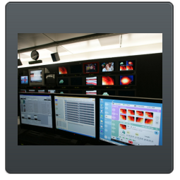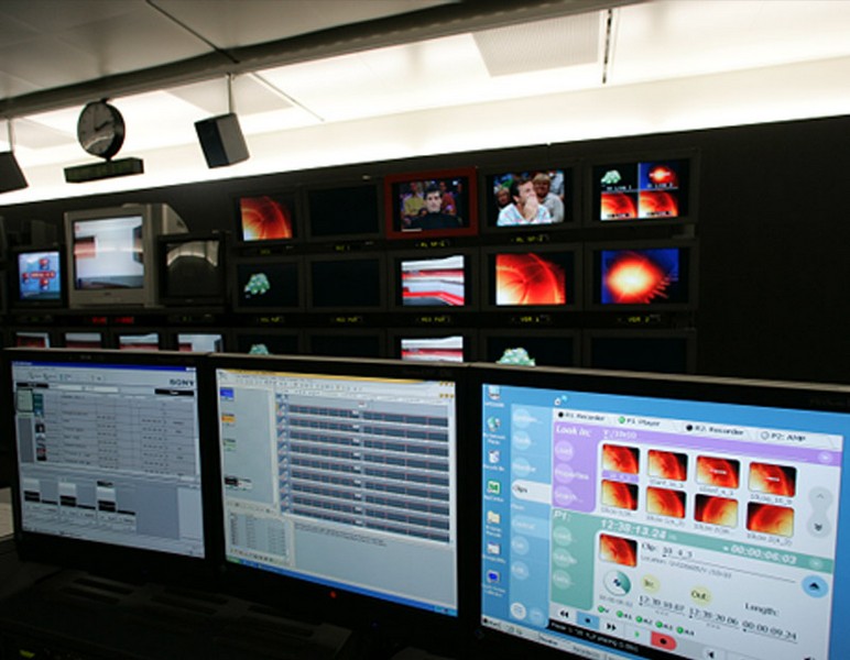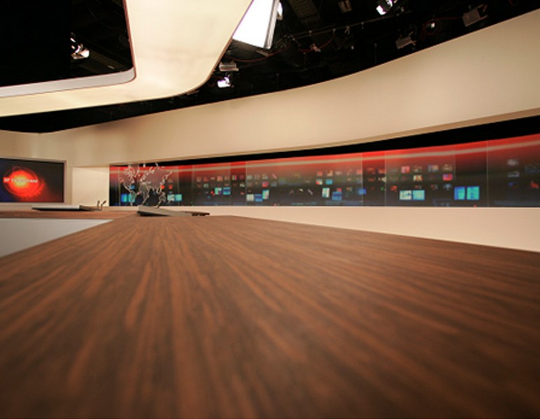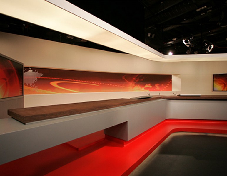 Die Multidisplay Technik von "Wings Platinum" erlaubt zudem die Verteilung jeder Grösse von Animationen, Bilder, Videos etc. auf die jeweilige Displays. Beim Schweizer Fernsehen sind zehn Barco Projektoren im Einsatz, es könnten aber auch steglose Plasmascreens oder TFTs sein.