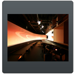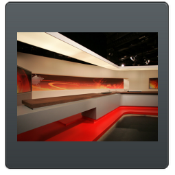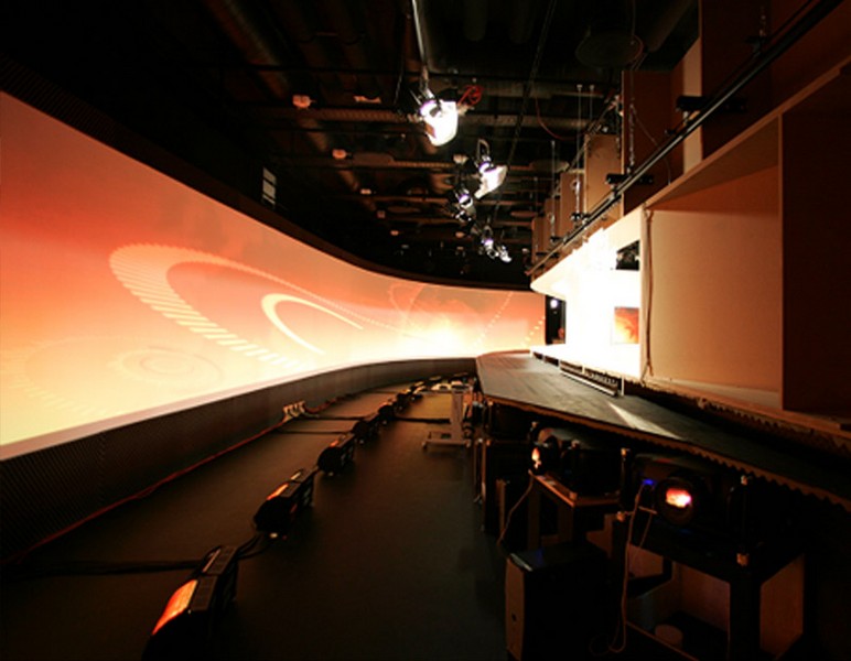 Auf einer gekrümmten Leinwand, mit einer Grösse von 21 x 2 m, projezieren 10 Barco Projektoren (Aufpro) täglich die Hintergrundbilder der Nachrichtensendungen des Schweizer Fernsehens.