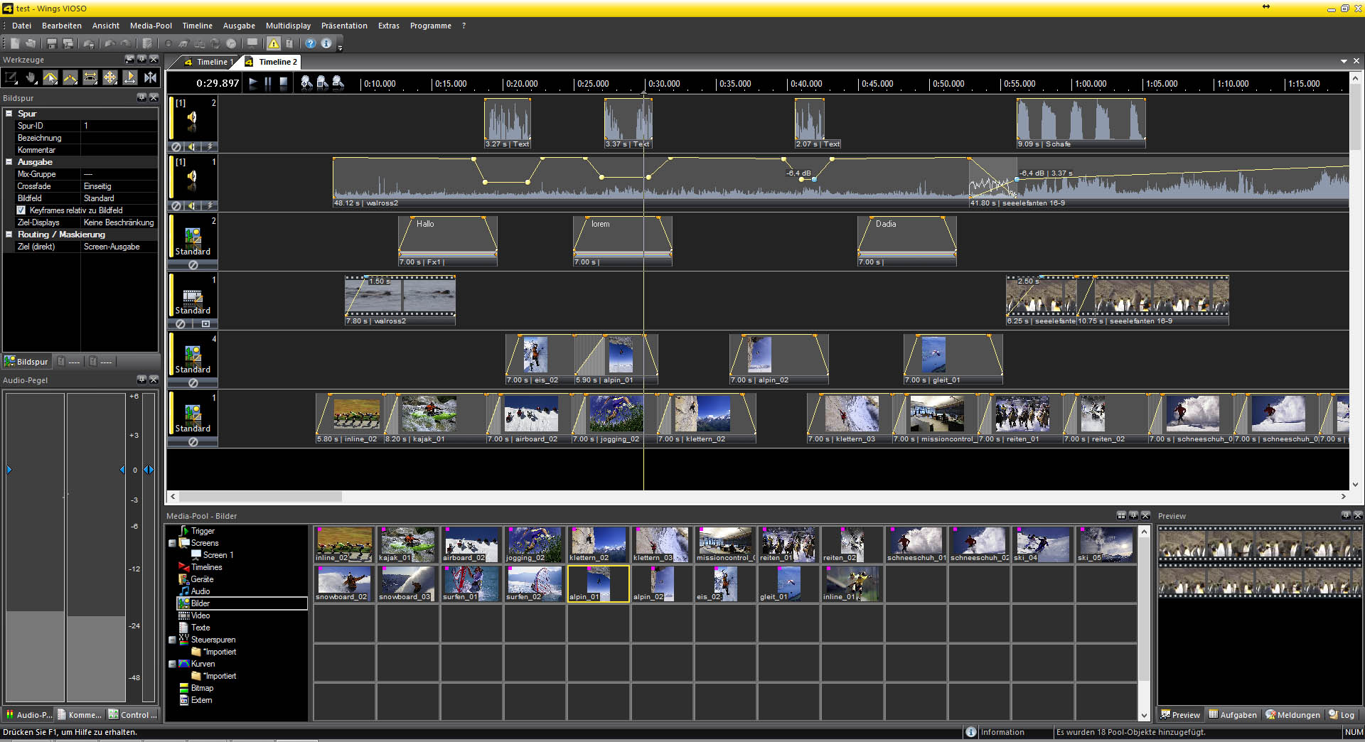mit Medienobjekten (Bilder, Töne, Videos, Texte, Fernsteuerbefehle, usw) in der Timeline.. Die Bearbeitung all dieser Objekte basiert auf einem einheitlichen Konzept und ist, wo immer von der Sache her möglich, identisch. Das macht das Arbeiten mit Wings Platinum besonders einfach.